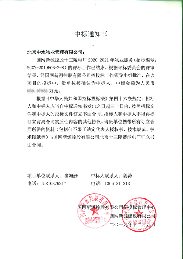 国网新源控股十三陵电厂2020-2021年物业服务项目成功中标