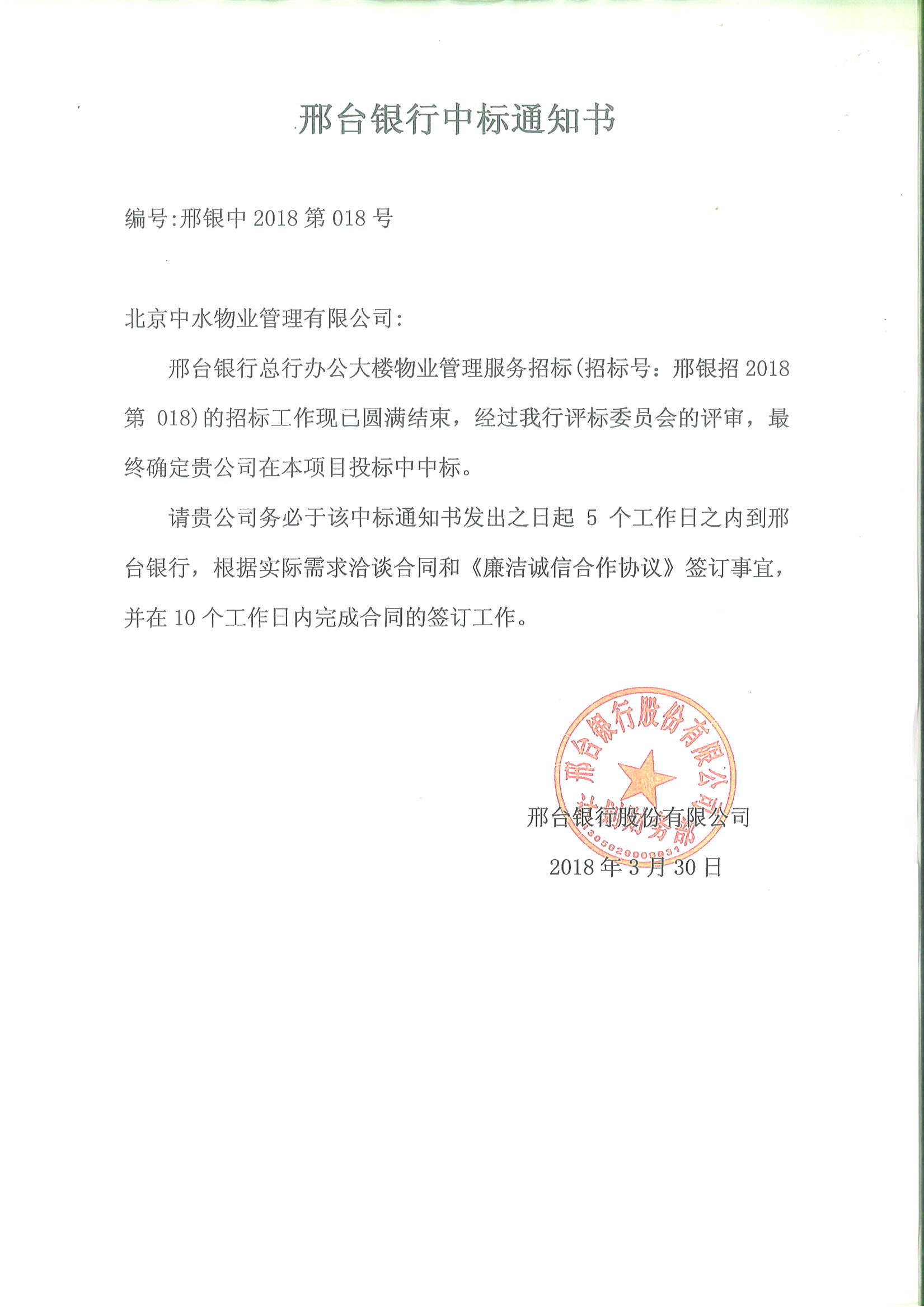 邢台银行总行办公大楼物业管理服务项目成功中标