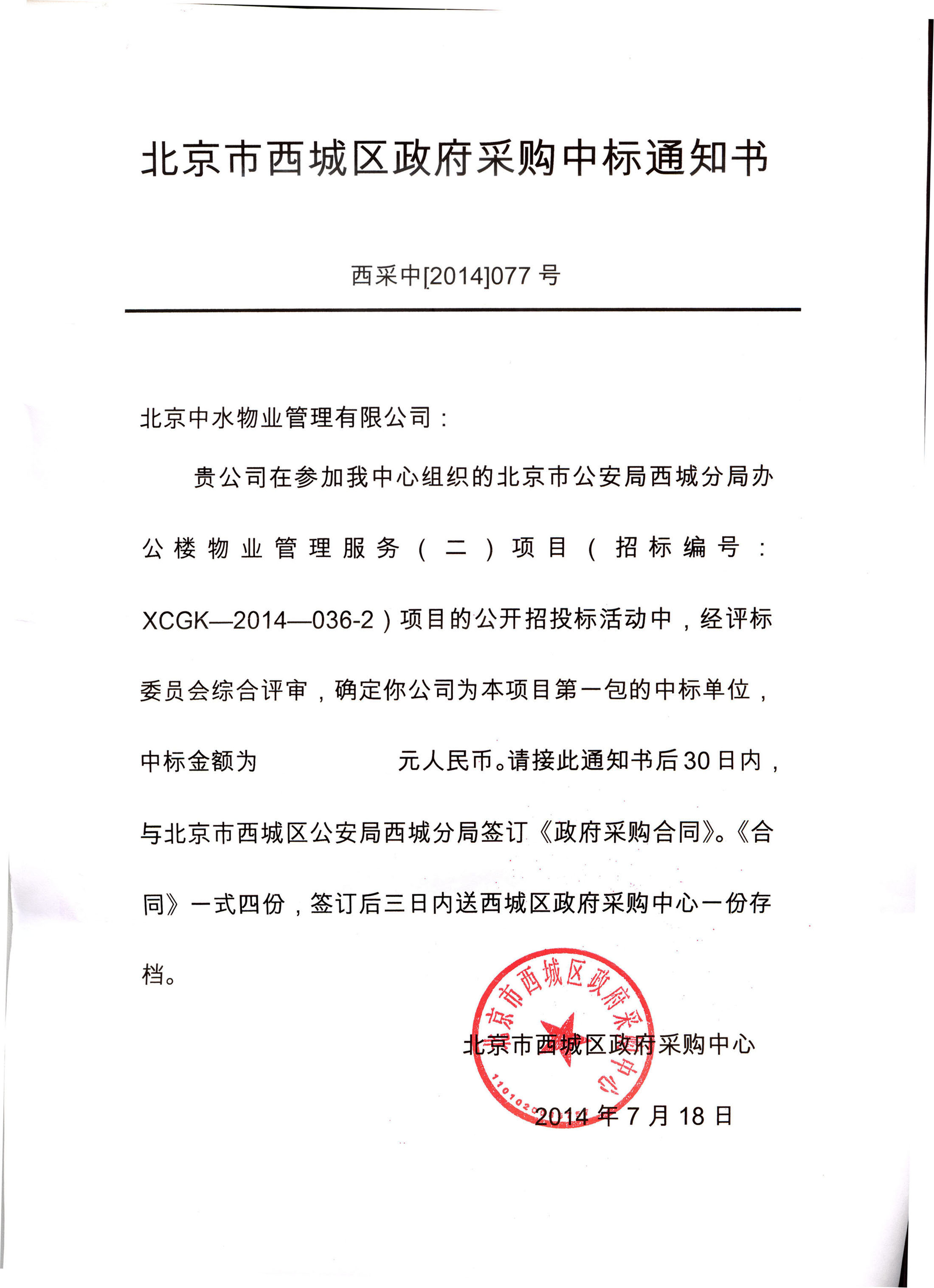 北京市公安局西城分局办公楼物业管理服务项目成功中标