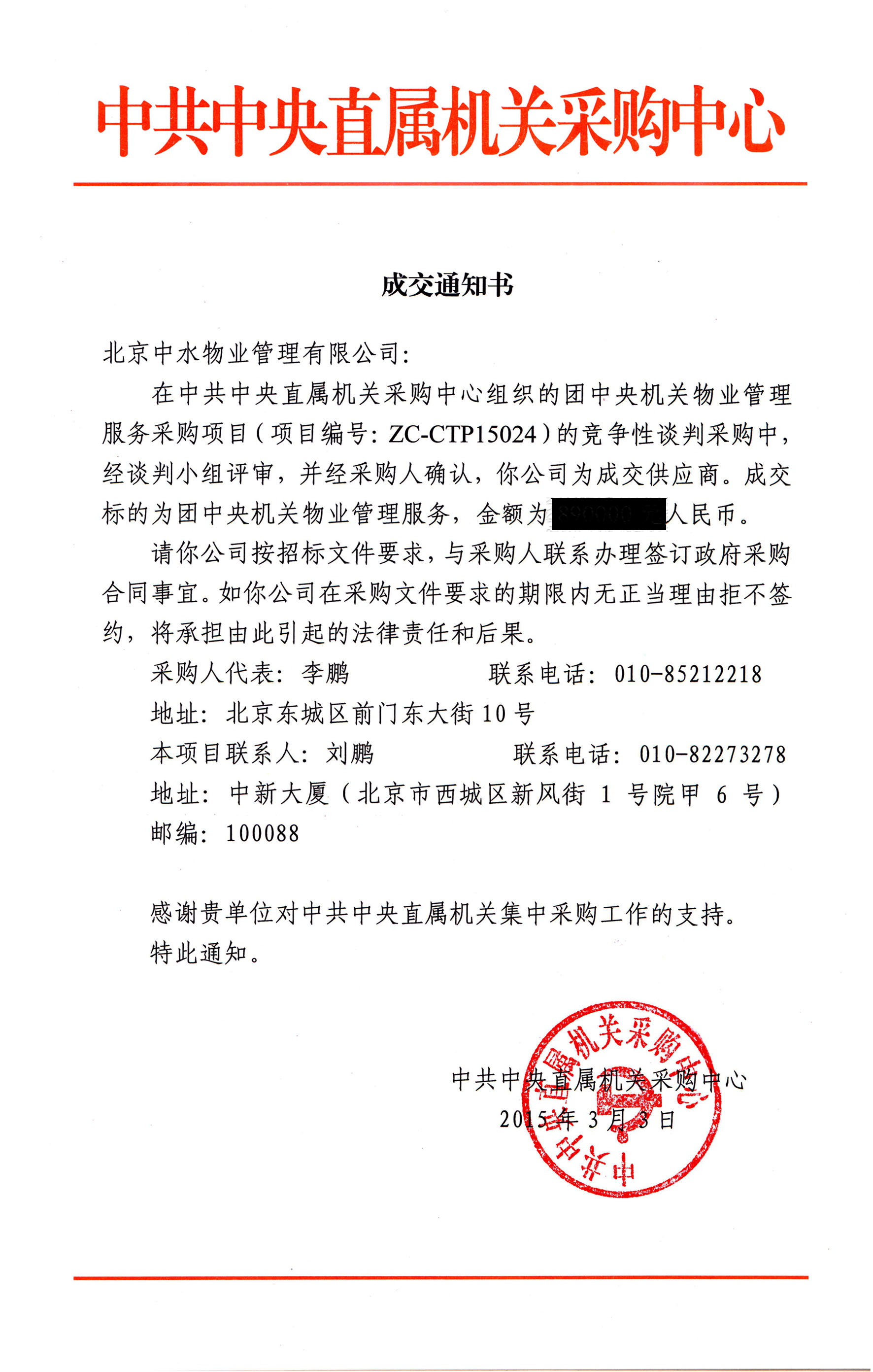 成功入围北京市通州区区级行政事业单位2014-2016年度物业服务定点采购供应商